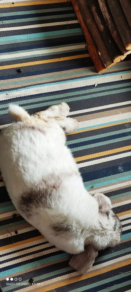 Couleur et variété : Lapin type bélier, robe blanche tachetée noir.
